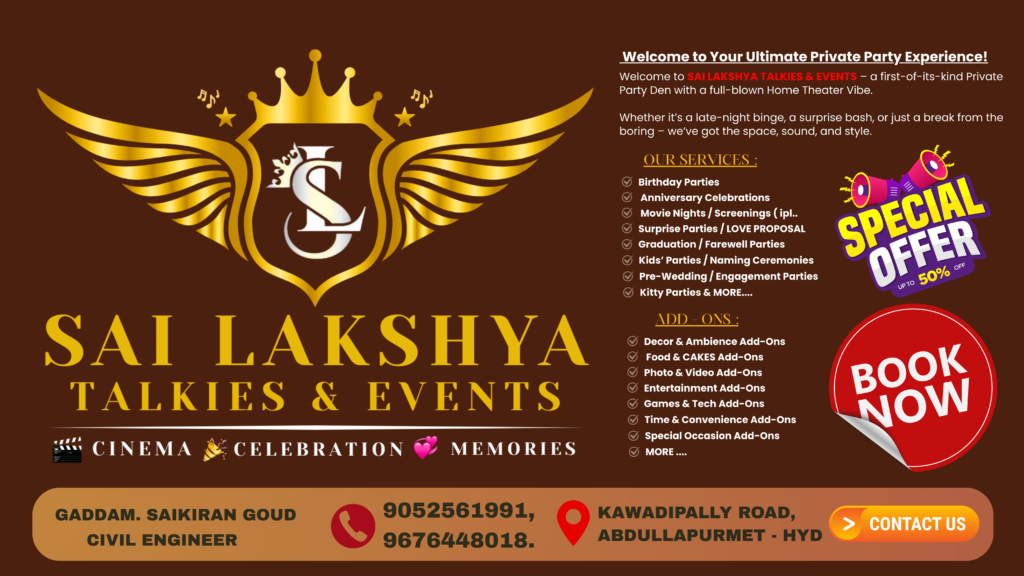 Sai Lakshya Talkies & Events is a premium private theatre located at Kawadipally Road, Abdullapurmet. We offer 3-hour private slots for birthdays, anniversaries, couple surprises, fan shows, and family celebrations in beautifully themed rooms with customized decorations and add-ons.